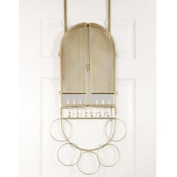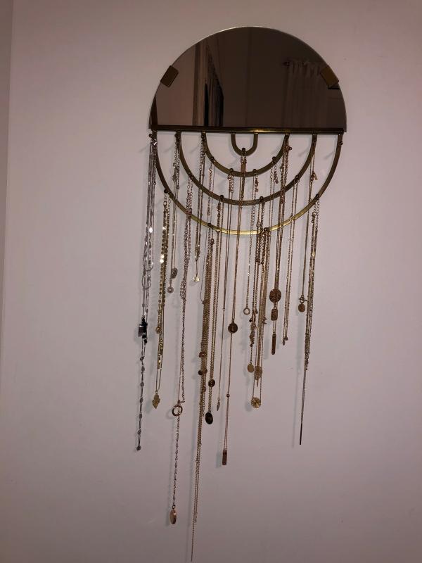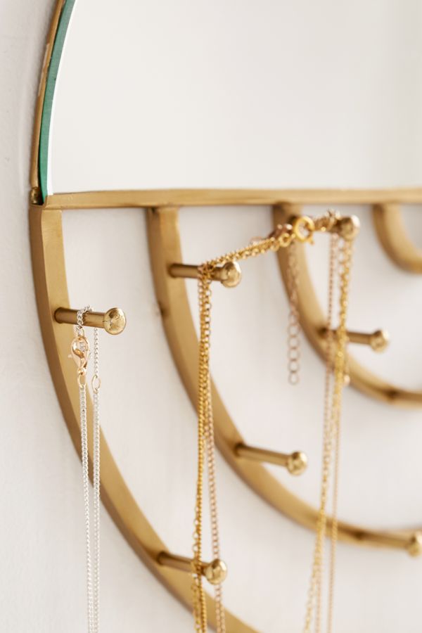 This geometric wall mirror slash jewelry organizer at urban outfitters is made from metal and glass and boasts ten hooks so you can display your baubles in style. Sign up for uo rewards and get 10 off your next purchase.