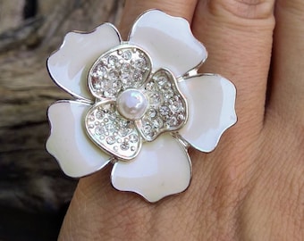 White Enamel Daisy Large Flower Fashion Ring Costume