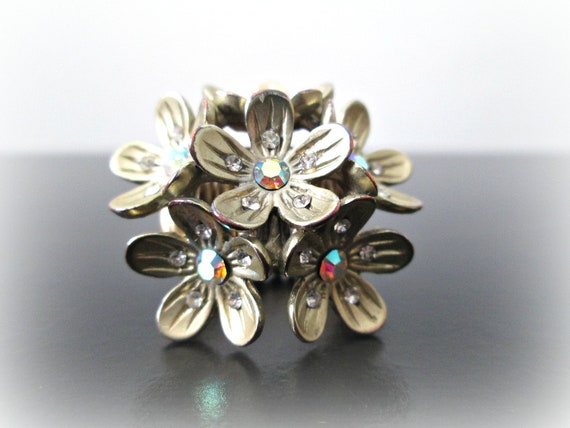Large Metal Flower Ring Vintage Rhinestone Costume Jewelry