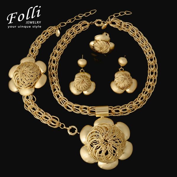 Whole Sale2017 Fashion Choker Jewelry Sets Big Flower Pendant Necklace Earrings Bracelet Dubai Gold Color African Costume Jewelry Sets Jewellery